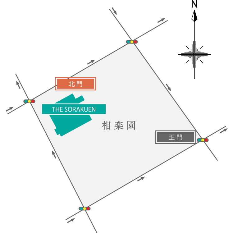 ※タクシーやお車でお越しの際は、相楽園 西側の一方通行よりお進みいただき、北門までお越しください。