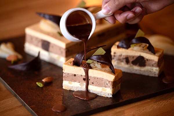 ベトナム産の高品質なチョコレートを使用し、しっとり焼いたブラウニーがたっぷりの濃厚なチョコレートアイスに、ほろ苦いキャラメルムースやフルーティなポワールムースを組み合わせた特製アイスケーキです。温かいチョコレートソースとともに。
