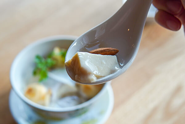 「原商店」特製の豆腐、豆乳、おから団子にキビ糖 しょうがのシロップをからめてお召し上がりください。