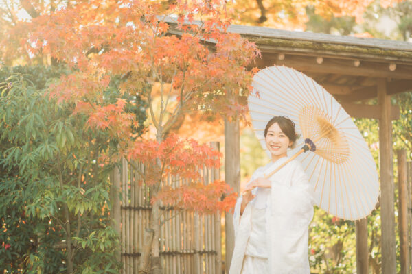 相楽園で大人気な前撮り。和装でも洋装でも映えるのでお衣装はどちらでもオススメ。