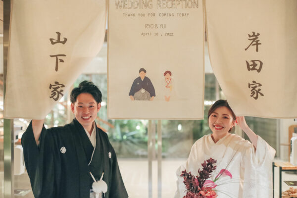 おふたりのお名前やイラストが入ったデザインに和装姿でお写真を撮影される方も多くいらっしゃいます。