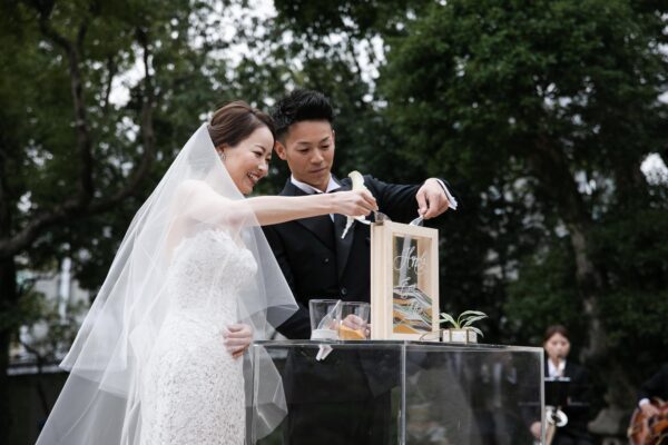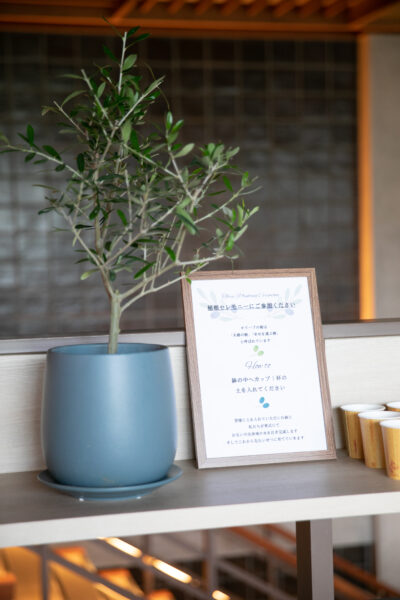 挙式をお待ちいただいている間に、ゲストの方に「オリーブの木」の鉢に土をお入れいただき、オリーブの木の鉢を完成いただきます!オリーブの木は雄の木と雌の木2種類があり、その2種類があわさってオリーブの実ができることから「夫婦の木」とのも呼ばれており、とっても素敵な意味合いがあります♪オリーブの鉢が完成しましたら、挙式の際におふたりでお水を注いでいただきます!お水は、ご実家のお水をお持ちいただき「両家の結びつき」の意味合いで行う方も多くいらっしゃいます♪オリーブの木はおふたりのご新居で大切に育ててくださいね♡