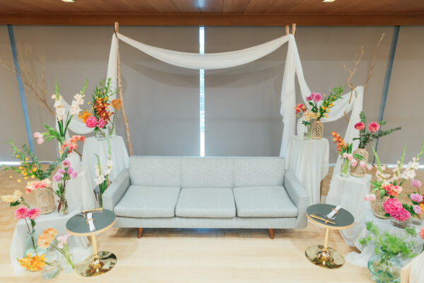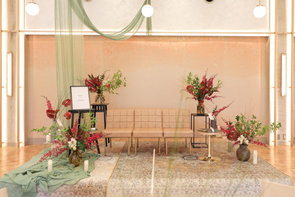 ソファ周りだけでなく、おふたりの後ろにアーチをかけるなど沢山デザインの幅がございますので、とことんこだわりたいご新郎ご新婦様にはとてもおススメです^^