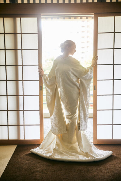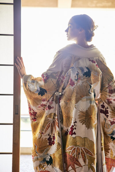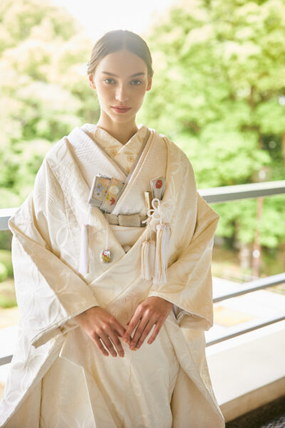 新作の白無垢は全身に七宝花丸の柄をあしらった上品な一着
