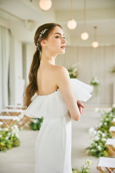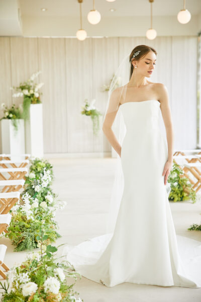 ベールをつける挙式ではシルエットが綺麗に見えるようスリーブは付けずにすっきりスタイルで