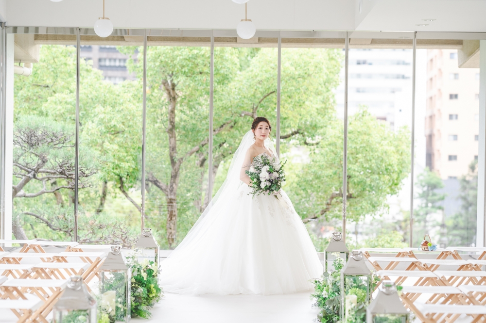 先程、ご紹介したホワイト×グリーンの組み合わせはもちろんウェディングドレスにもぴったりです。派手過ぎずシンプルな雰囲気は残したまま、統一感をもってコーディネートすることが可能です*