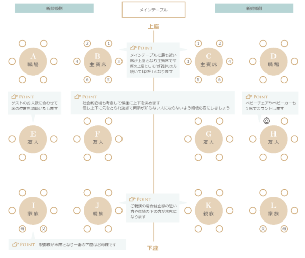 配席順番のルール(職場上司→職場の方々→友人→親族→家族)