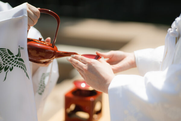▶ 「三々九度」という同じ盃で新郎新婦が交互にお神酒を酌み交わし永遠の契りを結ぶ儀式や