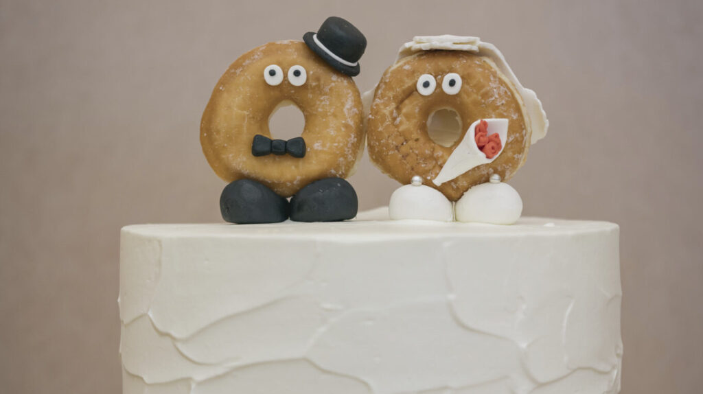ドーナツにお顔をつけて、なんと蝶ネクタイやブーケとベールまでつけている