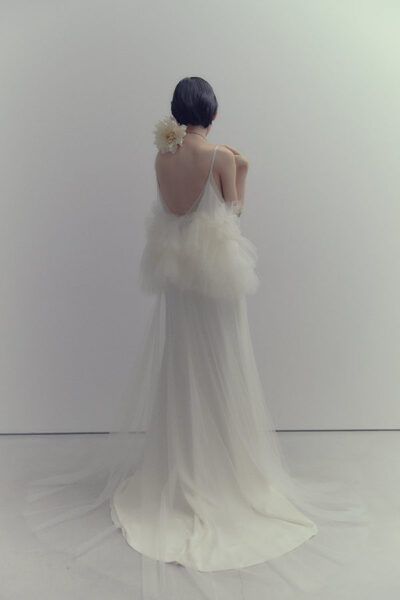 オープンなバックスタイルにロングトレーンが印象的な、