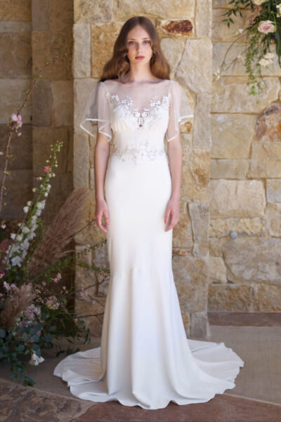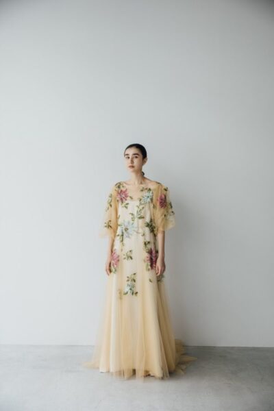 スレンダーガウンに、フローラルエンブロイダリーを華やかに装飾したオーバーガウンに