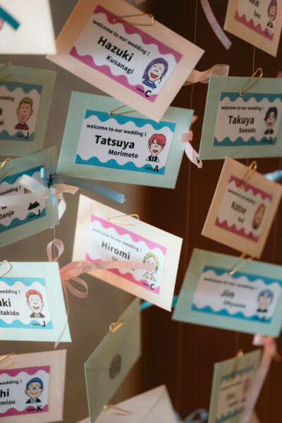 色つきの封筒にゲストの方それぞれの似顔絵入り!