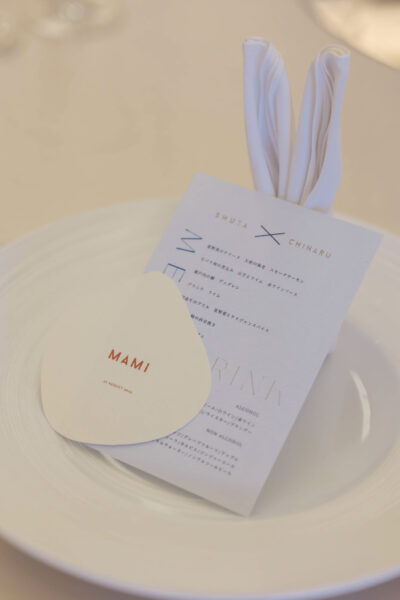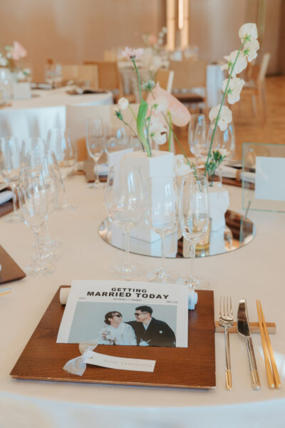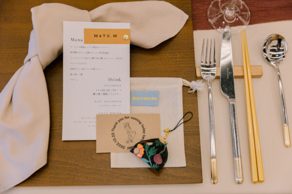 ゲストの席に置かれた席札兼引出物がテーブル全体の雰囲気を引き締めつつ