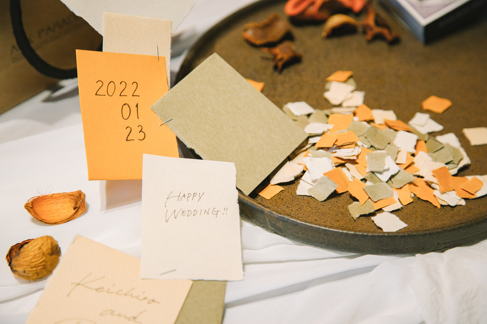 お色はふたりのお色直し衣装でもあるカーキとオレンジ。