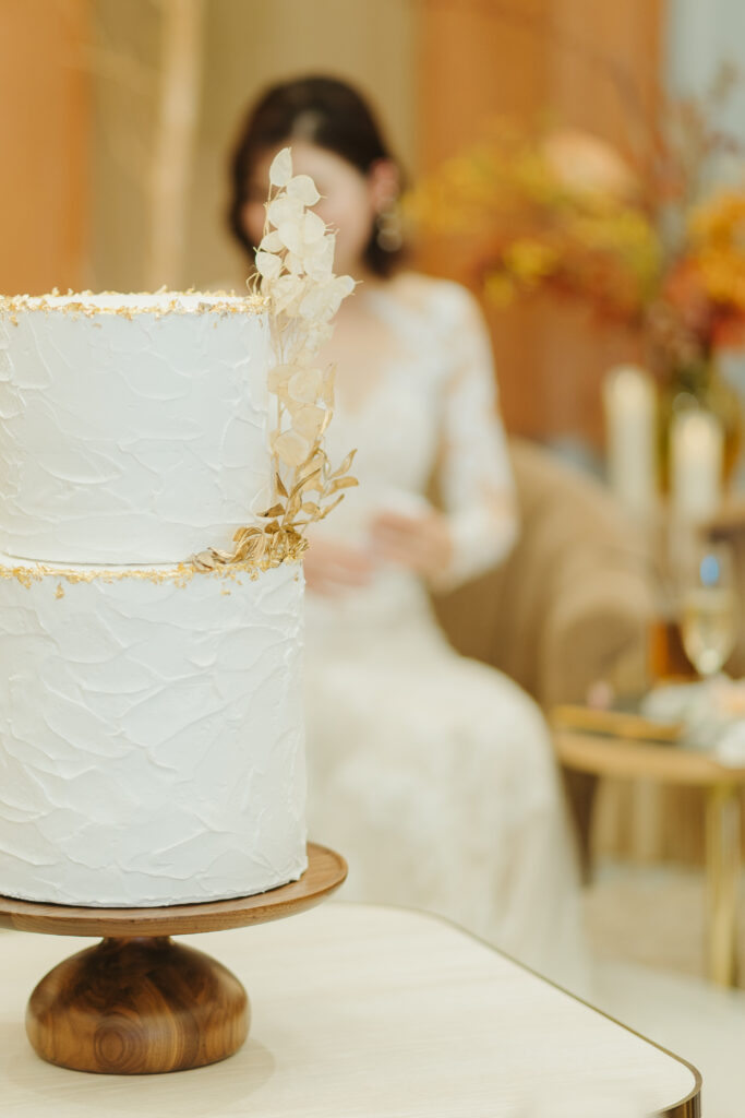 ホワイトのシンプルケーキにホワイトのお花を合わせ、アクセントに金箔をデザインするのがトレンド感たっぷりです!