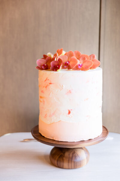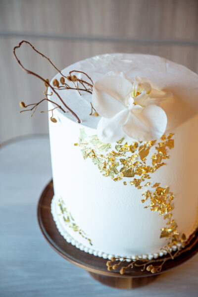こちらは金箔と胡蝶蘭を合わせた大人っぽいデザインが印象的なウエディングケーキです^^
