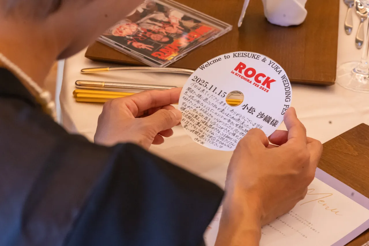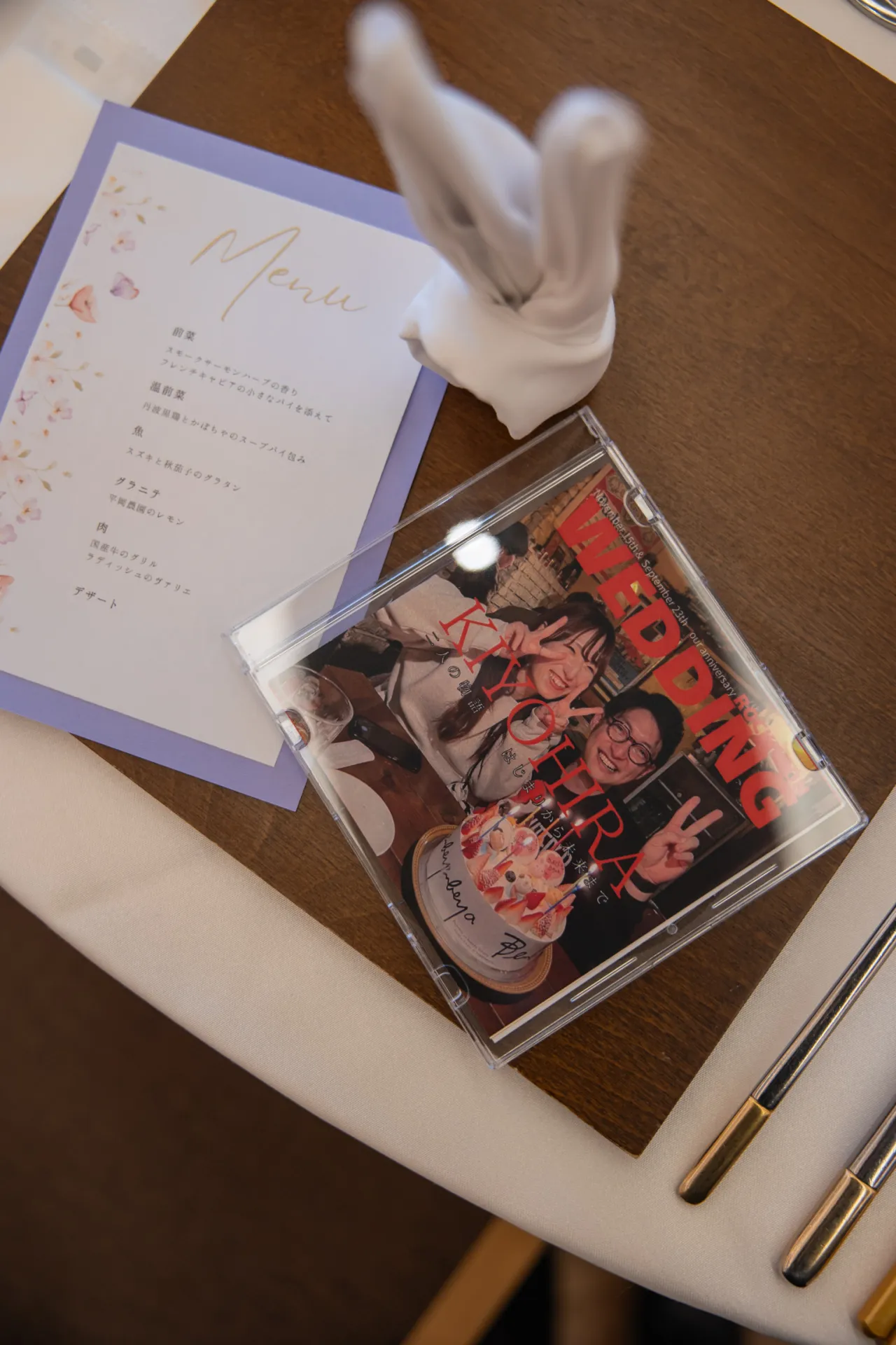 こちらもおふたりのこだわりが詰まった、CDの席札やメニュー表✨